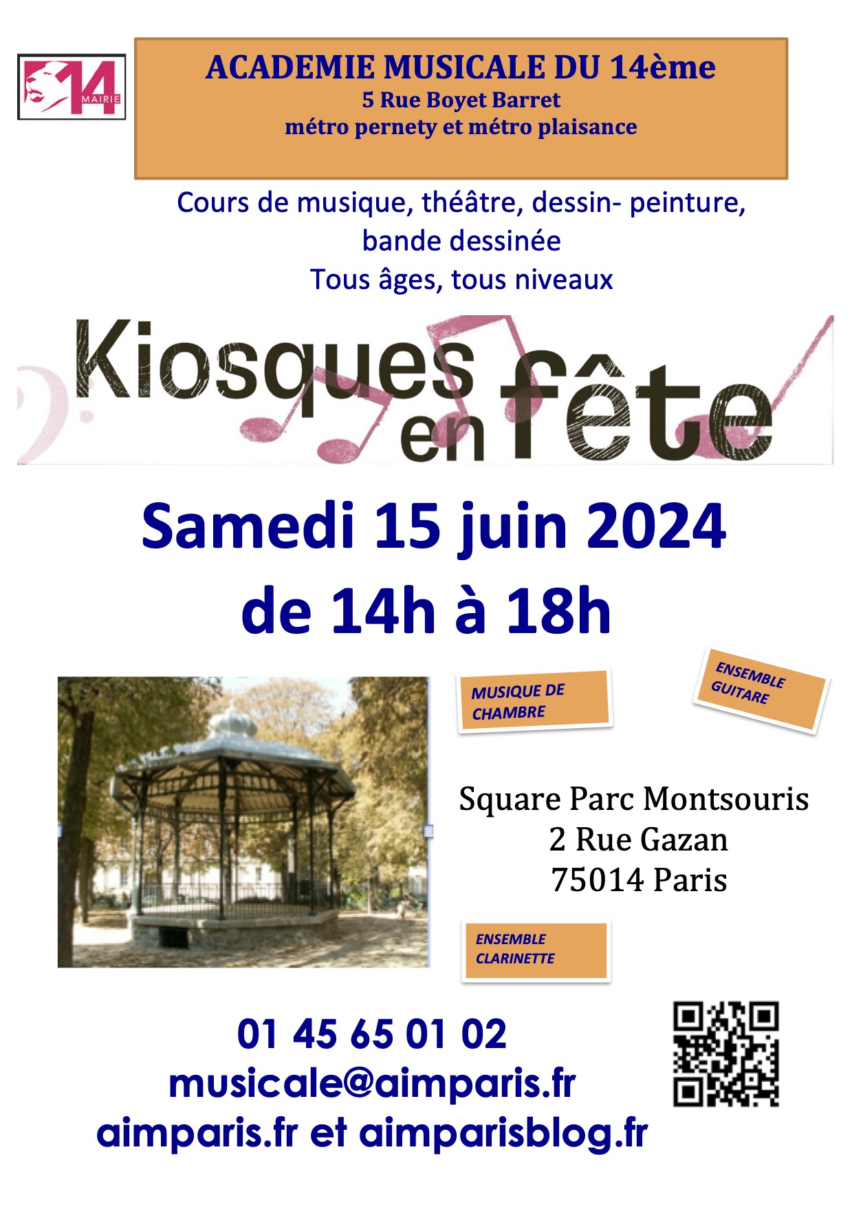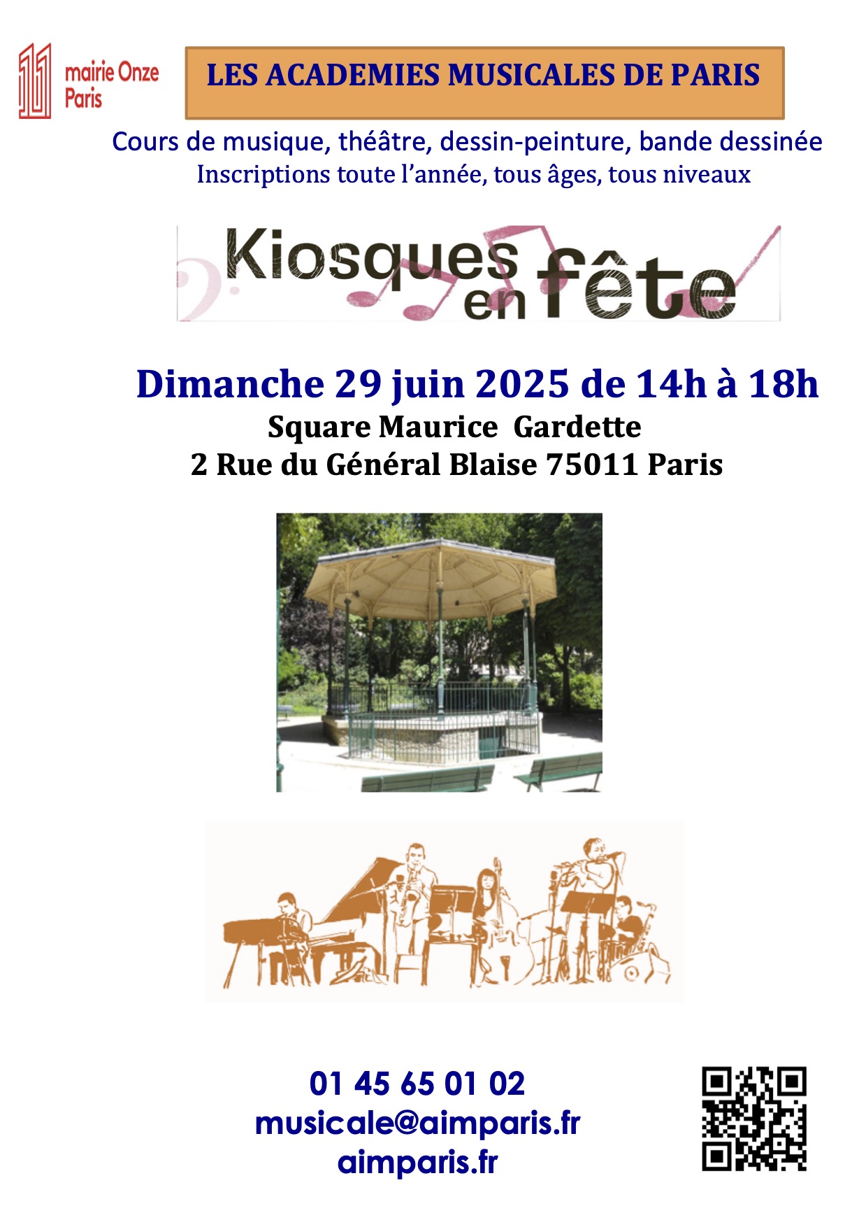 Nos professeurs : venez les écouter et les applaudir, partagez le plaisir de moments conviviaux et, profitez du beau temps avec nous dans les kiosques des squares parisiens !