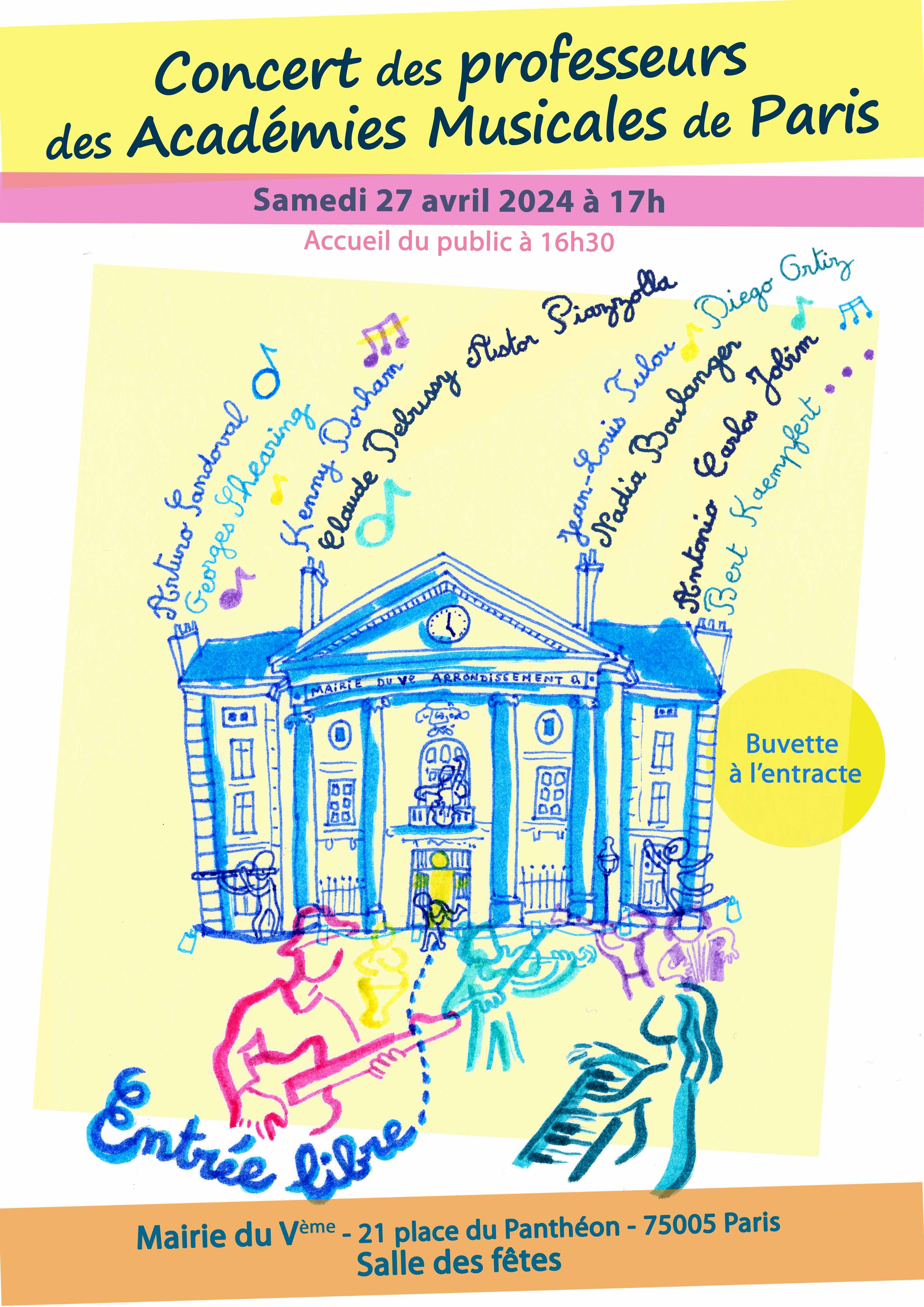 Représentation des professeurs et formateurs, samedi 27 avril 2024 à 17h : musique et théâtre à la salle des fêtes de la mairie du Vème arrondissement, 21 place du Panthéon.